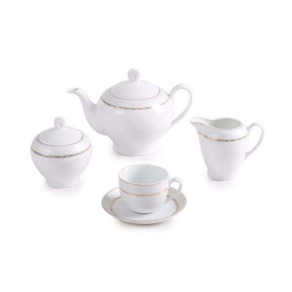 این طرح یکی از خاص ترین طرح های چینی زرین است که طی چند سال اخیر نمونه های مشابه مانند ریوا طلایی و سپید صدف تولید شده اند. طرح هدیه طلایی این سرویسی که در بالا مشاهده می کنید از قالب ایتالیا اف که بشقاب هایی گرد با سایز بزرگ ۲۷ سانتی , ظروف فوق العاده ای که با لعاب شفاف و طلای ناب مزین شده است برای میزبانی به چشمگیرترین حالت ممکن و طراحی شده برای سبک زندگی امروز هستند.