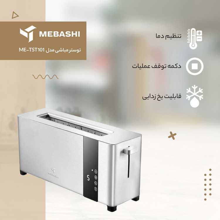 جنس بدنه استیل - قابلیت یخ زدایی از نان -دارای صفحه لمسی - دارای 7 حالت تست - دارای سینی جمع آوری نان - تک خانه به طول 40 سانتی متر