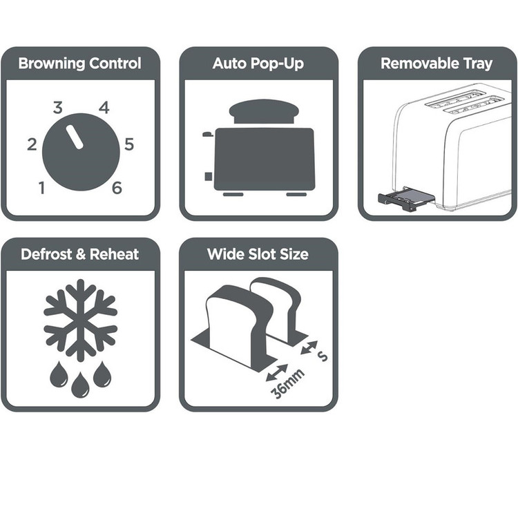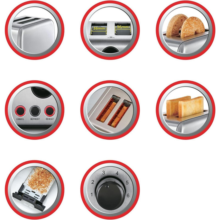 سایر توضیحات: دستگاه خوش ساخت با ظاهری تمام فلزی، توان 1050 وات، دارای دو اسلات پهن، قابلیت یخ زدایی defrost، با قابلیت گرم کردن مجدد reheat، قطع کن خودکار، دارای تنظیم سطح برشتگی نان و گرما در 6 حالت بصورت ولومی، دارای کشوی خرده نان، بدنه استیل
