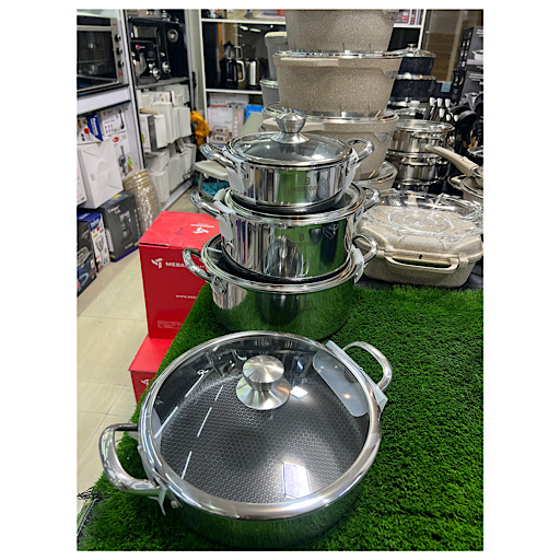 سرویس قابلمه 8 تکه استیل کف لیزری بیدستون آلمان 3 قابلمه از سایز های 20 سانتی متری 2/5 لیتری-24سانتی متری 4/5 لیتری-28 سانتی متری 7/3 لیتری و تابه 28 سانتی متری 4/5 لیتری کفه لیزری نچسب با تکنولوژی کشور آلمان استیل 304 درجه یک بدون تغییر رنگ